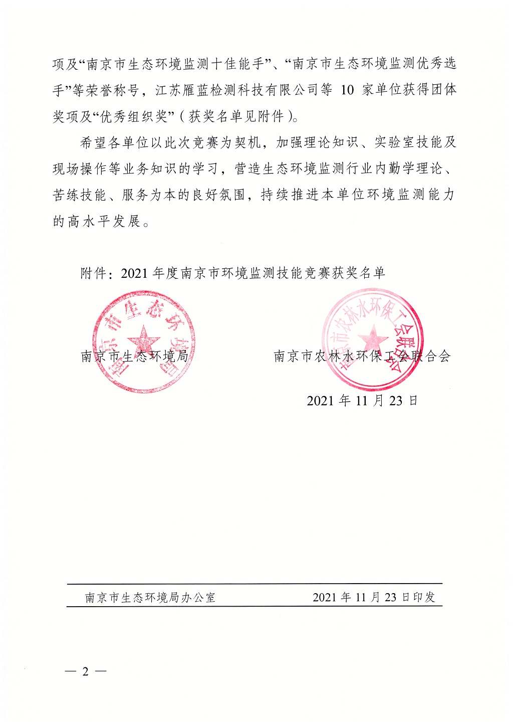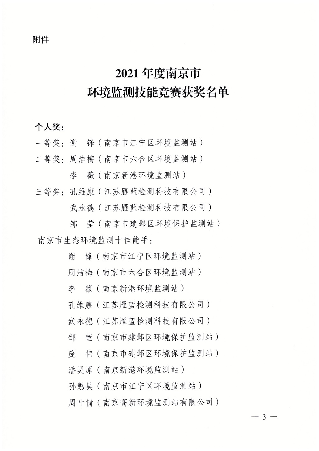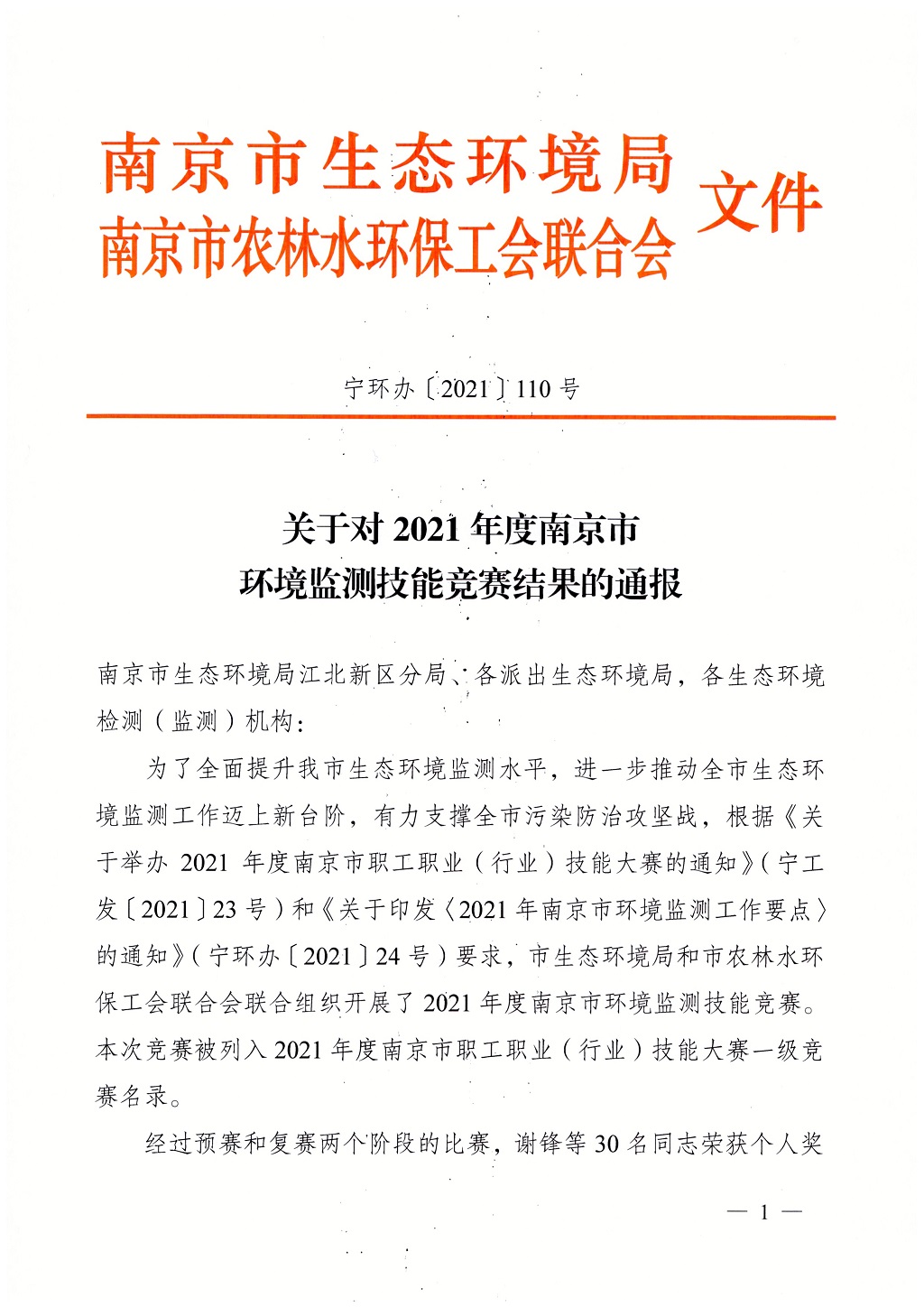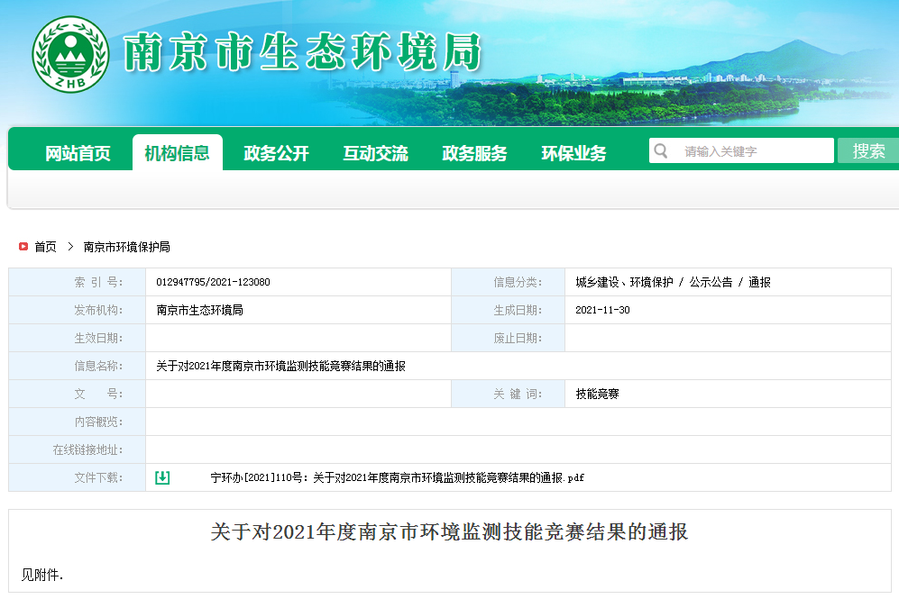 10月16日-27日,由南京市總工會、市人力資源和社會保障局、共青團南京市委主辦,南京市生態環境局和南京市農林水環保工會聯合會承辦,江蘇省南京環境監測中心協辦,南京環境保護產業協會支持的2021年南京市環境監測技能競賽決賽在江寧橫溪街道正式開賽,來自市生態環境系統和社會化環境監測機構的16支環境監測隊伍在此聚集進行環境監測大比武。本次競賽由南京市生態環境局局長錢鋒擔任競賽組委會主任,同時專設專家及監督委員會,確保競賽結果公正公允。我司也派出選手參賽,取得團體一等獎和多個個人獎項的佳績!