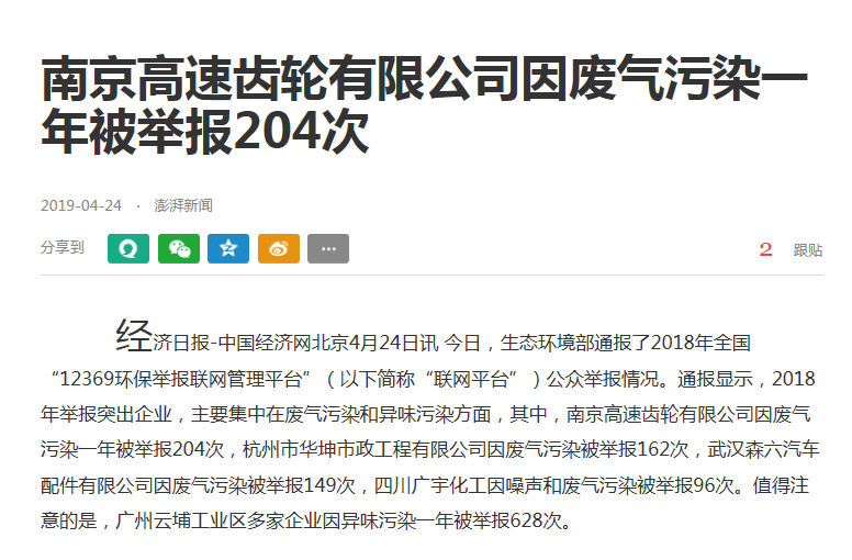 2019年,我司對南京高速齒輪有限公司的展開了環(huán)境檢測,該公司因廢氣和異味一年被舉報達數(shù)百次(下圖為新聞截圖)。